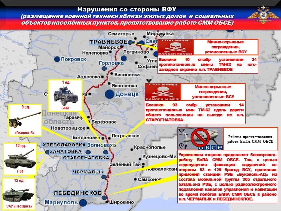 Украинская сторона продолжила блокировать работу БпЛА СММ ОБСЕ с использованием станции РЭБ «Буковель-АД» из состава 305-го батальона РЭБ для недопущения фиксации нарушений со стороны 93-й и 128-й бригад в районах н.п. ЧЕРМАЛЫК и ЛЕБЕДИНСКОЕ.