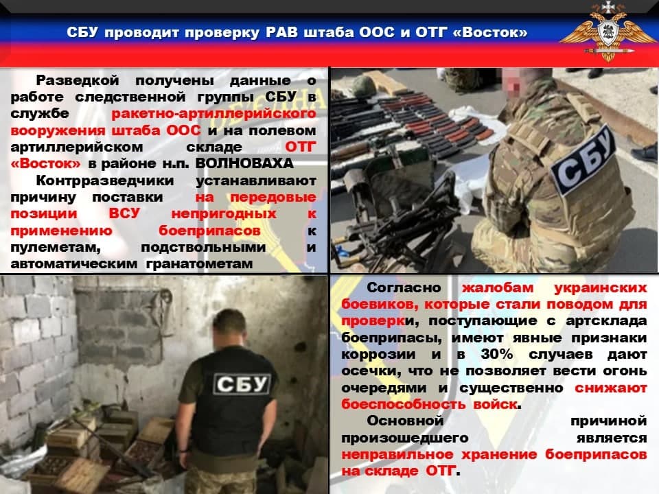 Согласно жалобам украинских боевиков, которые стали поводом для проверки, поступающие с артсклада боеприпасы, имеют явные признаки коррозии и в 30% случаев дают осечки, что не позволяет вести огонь очередями и существенно снижают боеспособность войск.