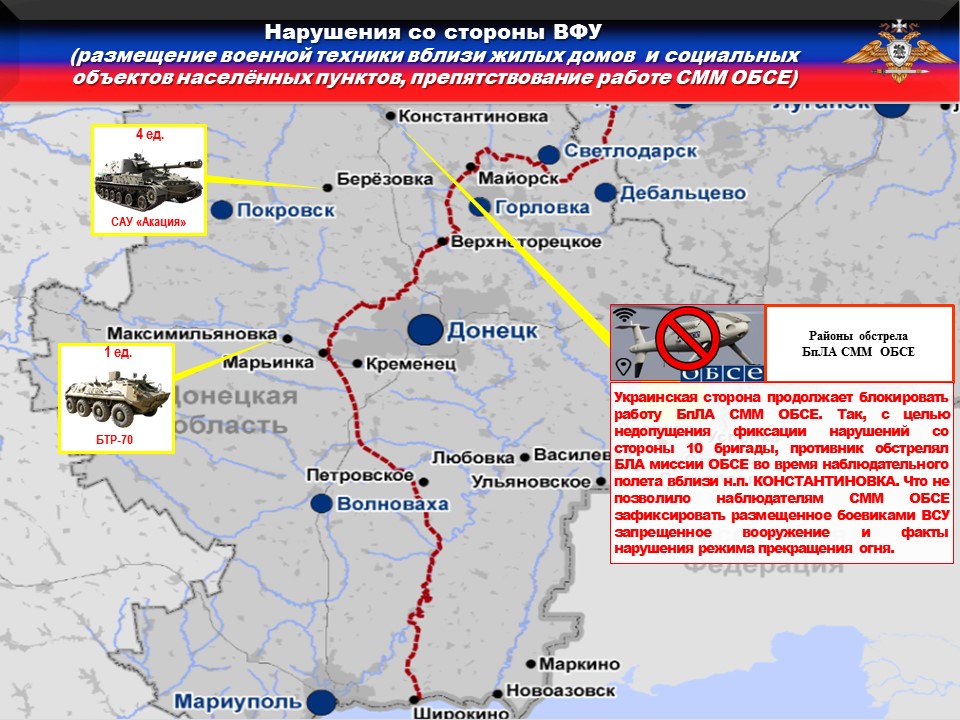 Украинская сторона продолжает блокировать работу БпЛА СММ ОБСЕ. Так, с целью недопущения фиксации нарушений со стороны 10 бригады, противник обстрелял беспилотник миссии ОБСЕ во время наблюдательного полета вблизи н.п. КОНСТАНТИНОВКА. Открытая агрессия украинских боевиков и игнорирование взятых на себя обязательств не позволяют наблюдателям СММ ОБСЕ зафиксировать размещенное украинскими боевиками запрещенное вооружение.