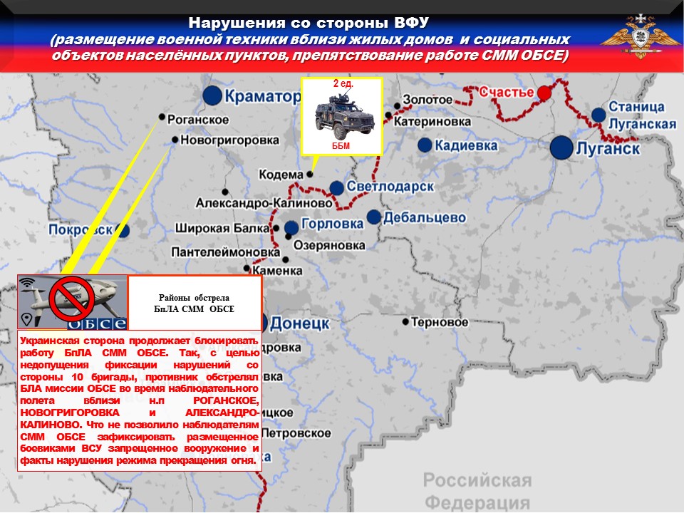Кроме того, украинская сторона продолжает блокировать работу БпЛА СММ ОБСЕ. Так, с целью недопущения фиксации нарушений со стороны 10 бригады, противник применил станции РЭБ «Буковель-АД» из состава мобильных групп 502 отдельного батальона РЭБ, с целью радиоэлектронного подавления каналов управления и навигации во время полётов БпЛА СММ ОБСЕ в районах н.п. РОГАНСКОЕ, НОВОГРИГОРОВКА и АЛЕКСАНДРО-КАЛИНОВО.
