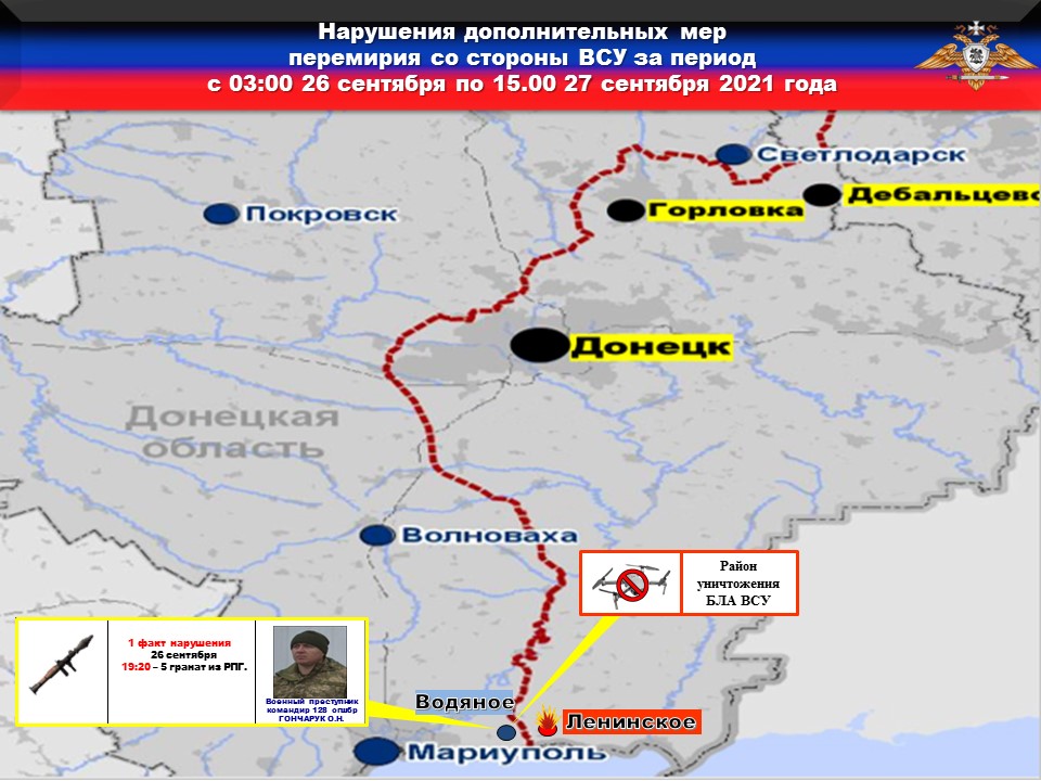 Обстрелу из гранатометов предшествовала воздушная разведка при помощи беспилотного летательного аппарата. По нашим данным, во время работы БЛА, противник в районе н.п. ВОДЯНОЕ развернул минометный расчет. Своевременное обнаружение беспилотника военнослужащими НМ позволило вовремя уничтожить его. Сбитый БЛА упал в межпозиционном пространстве. Отсутствие возможности корректировать огонь с воздуха не позволило украинским боевикам осуществить обстрел нашей территории. Прикрывая убытие с огневой позиции минометного расчета, противник открыл гранатометный огонь по нашим позициям.