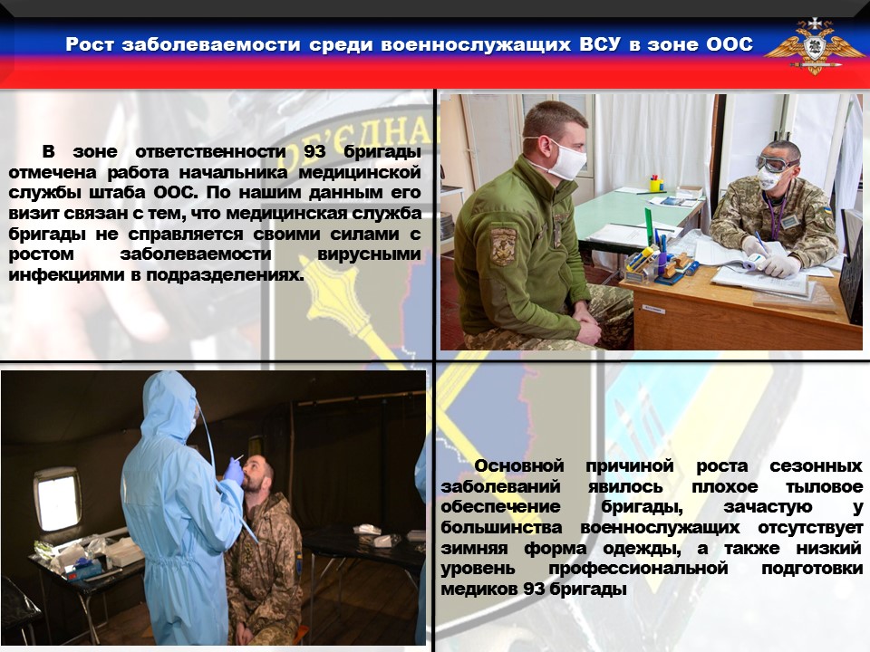 В зоне ответственности 93 бригады отмечена работа начальника медицинской службы штаба ООС. По нашим данным его визит связан с тем, что медицинская служба бригады не справляется своими силами с ростом заболеваемости вирусными инфекциями в подразделениях.