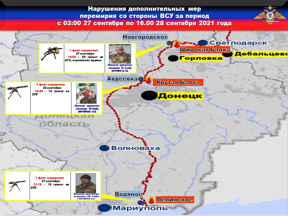 Факты нарушений в оперативном порядке доведены до представителей украинской стороны в СЦКК, с целью своевременного принятия мер к нарушителям перемирия и исключения фальсификации данных о нарушениях режима прекращения огня со стороны украинских боевиков.