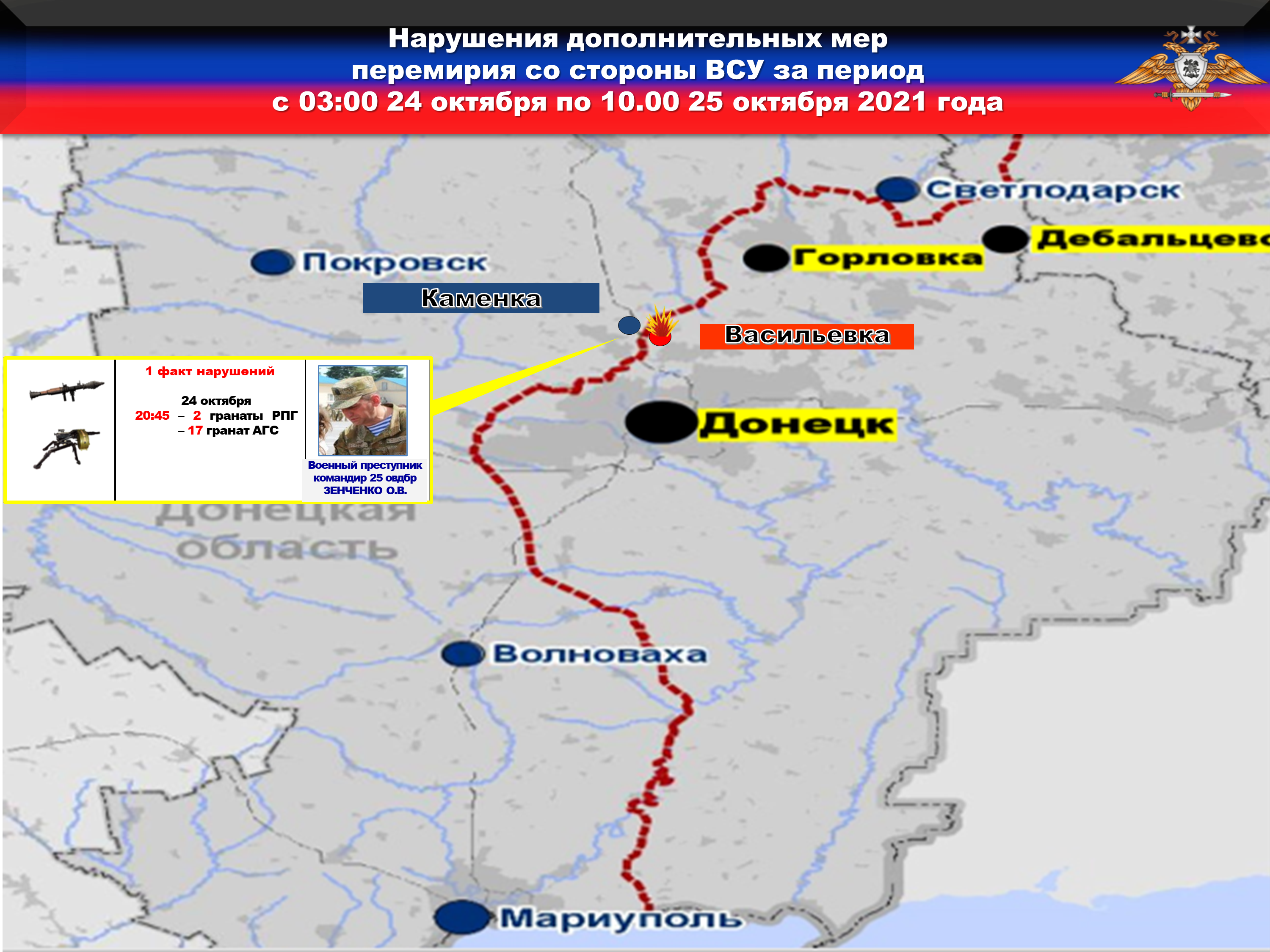 На Донецком направлении боевики 25 бригады с позиций в районе н.п. КАМЕНКА по приказу военного преступника ЗЕНЧЕНКО открыли огонь из РПГ и АГС по н.п. ВАСИЛЬЕВКА, выпустив ДЕВЯТНАДЦАТЬ гранат.