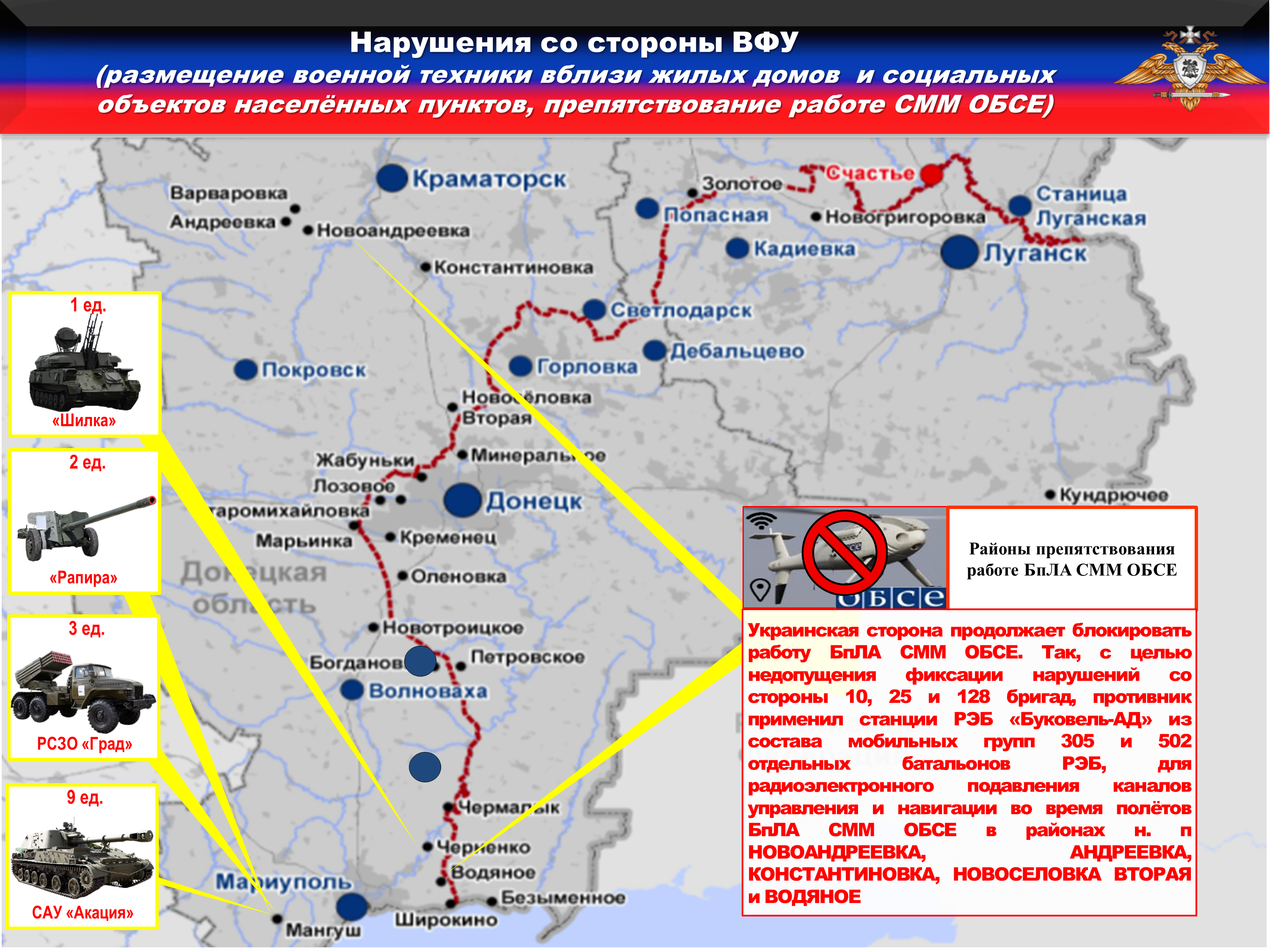 Украинская сторона продолжает блокировать работу БпЛА СММ ОБСЕ. Так, с целью недопущения фиксации нарушений со стороны 10, 25 и 128 бригад, противник применил станции РЭБ «Буковель-АД» из состава мобильных групп 305 и 502 отдельных батальонов РЭБ, для радиоэлектронного подавления каналов управления и навигации во время полётов БпЛА СММ ОБСЕ в районах н. п НОВОАНДРЕЕВКА, АНДРЕЕВКА, КОНСТАНТИНОВКА, НОВОСЕЛОВКА ВТОРАЯ и ВОДЯНОЕ.