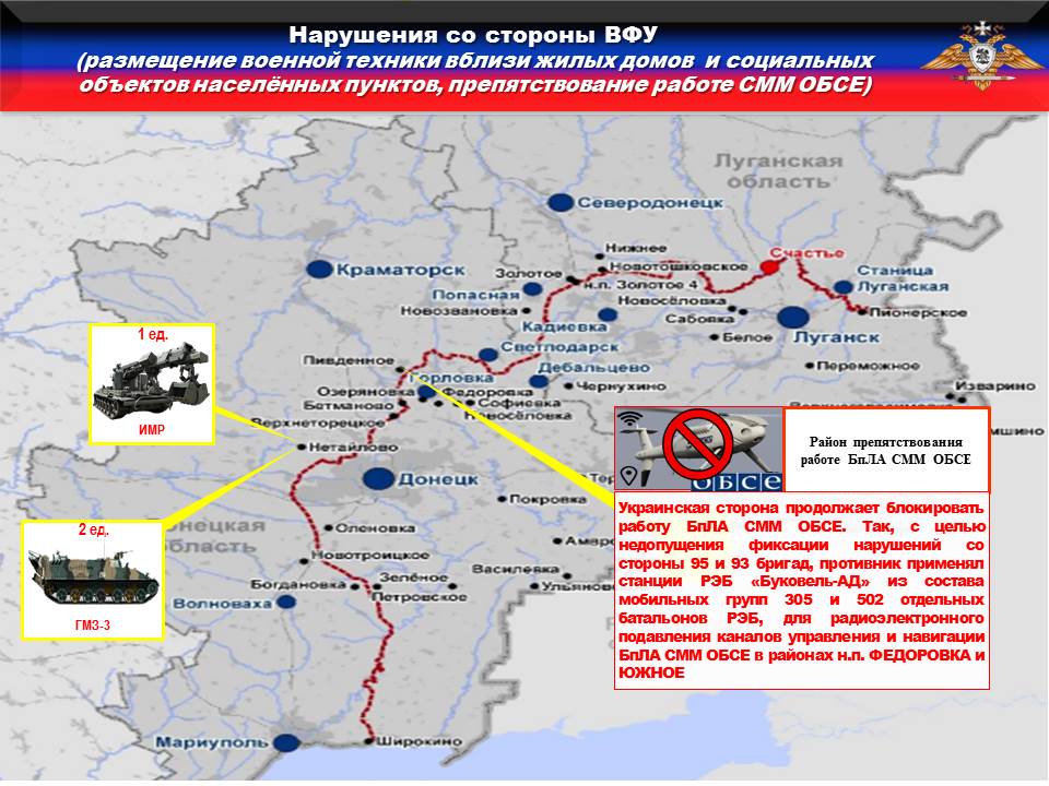 Украинская сторона продолжает блокировать работу БпЛА СММ ОБСЕ. Так, с целью недопущения фиксации нарушений со стороны 95 и 93 бригад, противник применял станции РЭБ «Буковель-АД» из состава мобильных групп 305 и 502 отдельных батальонов РЭБ, для радиоэлектронного подавления каналов управления и навигации БпЛА СММ ОБСЕ в районах н.п. ФЕДОРОВКА и ЮЖНОЕ.