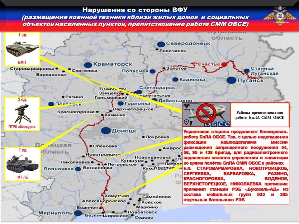 Украинская сторона продолжает блокировать работу БпЛА ОБСЕ. Так, с целью недопущения фиксации наблюдателями миссии размещения запрещенного вооружения 54, 56, 95 и 128 бригад, для радиоэлектронного подавления каналов управления и навигации во время полётов БпЛА СММ ОБСЕ в районах