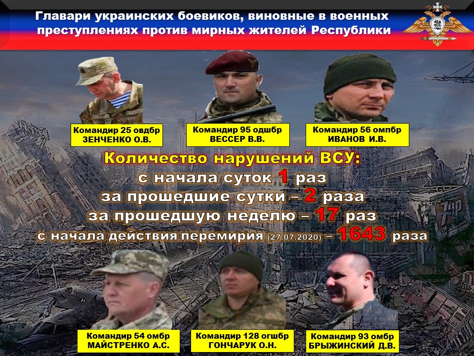 За прошедшую неделю зафиксировано СЕМНАДЦАТЬ нарушений режима прекращения огня со стороны украинских вооруженных формирований. Противник вел огонь по населённым пунктам Республики, применяя запрещенные Минскими соглашениями минометы калибром 120 и 82 мм. Также при обстрелах применялись БМП-2, различные типы гранатометов и стрелковое оружие.