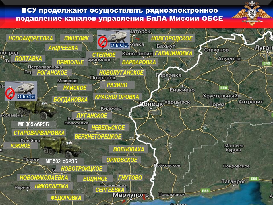 За неделю зафиксировано СОРОК фактов подавления каналов управления и навигации БпЛА наблюдателей СММ ОБСЕ вдоль линии боевого соприкосновения, в районах ТРИДЦАТИ населенных пунктов: ФЕДОРОВКА, ЮЖНОЕ, НОВОЛУГАНСКОЕ, ГНУТОВО, ПОЛТАВКА, АНДРЕЕВКА, НОВОАНДРЕЕВКА, ПИЩЕВИК, ГАЛИЦИНОВКА, ПРИВОЛЬЕ, НОВГОРОДСКОЕ, РАЙСКОЕ, СТЕПНОЕ, СТАРОВАРВАРОВКА, НОВОТРОИЦКОЕ, СЕРГЕЕВКА, ВАРВАРОВКА, ВОДЯНОЕ, РАЗИНО, РОАГНСКОЕ, КРАСНОГОРОВКА, ВЕРХНЕТОРЕЦКОЕ, НИКОЛАЕВКА, НОВОНИКОЛАЕВКА, БОГДАНОВКА, ВОЛНОВАХА, ЛУГАНСКОЕ, НЕВЕЛЬСКОЕ, НИКОЛАЙПОЛЬЕ и ОРЛОВСКОЕ.
