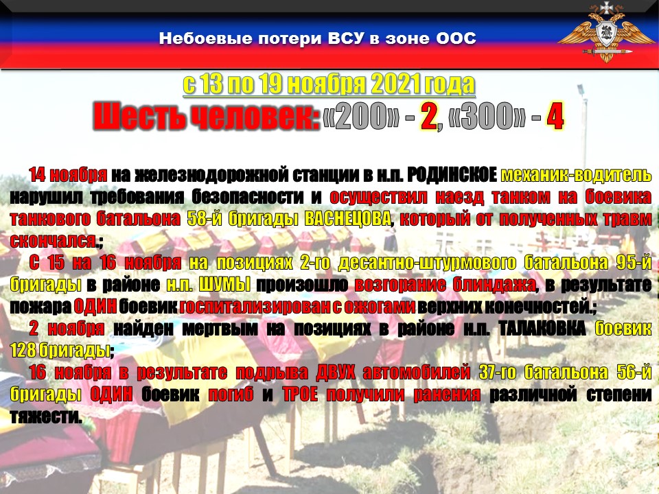 В период с 13 по 19 ноября в зоне ответственности ОТГ «Восток» небоевые потери составили ШЕСТЬ человек, ДВОЕ из которых погибли: