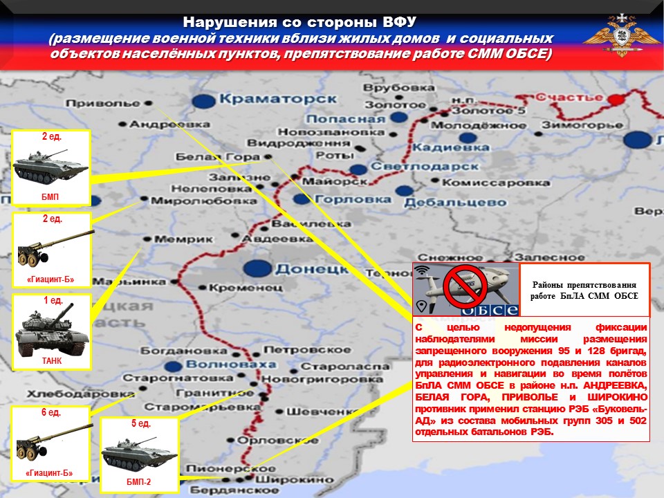 Украинская сторона продолжает блокировать работу БпЛА ОБСЕ. Так, с целью недопущения фиксации наблюдателями миссии размещения запрещенного вооружения 95 и 128 бригад, для радиоэлектронного подавления каналов управления и навигации во время полётов БпЛА СММ ОБСЕ в районе н.п. АНДРЕЕВКА, БЕЛАЯ ГОРА, ПРИВОЛЬЕ и ШИРОКИНО противник применил станцию РЭБ «Буковель-АД» из состава мобильных групп 305 и 502 отдельных батальонов РЭБ.