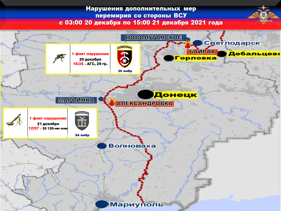 В нарушение ТРЕТЬЕГО пункта дополнительных мер, киевские оккупанты разместили ДВА бронетранспортера в подконтрольных населенных пунктах, ОДИН во дворе жилого дома в н.п. НОВОБАХМУТОВКА из состава 95 одшбр и еще ОДИН на северной окраине н.п. МИРОНОВКА из состава 30 омбр.