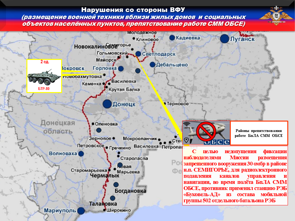 н.п. СЕМИГОРЬЕ, для радиоэлектронного подавления каналов управления и навигации, во время полёта БпЛА СММ ОБСЕ, противник применил станцию РЭБ «Буковель-АД» из состава мобильной группы 20 отдельного батальона РЭБ.