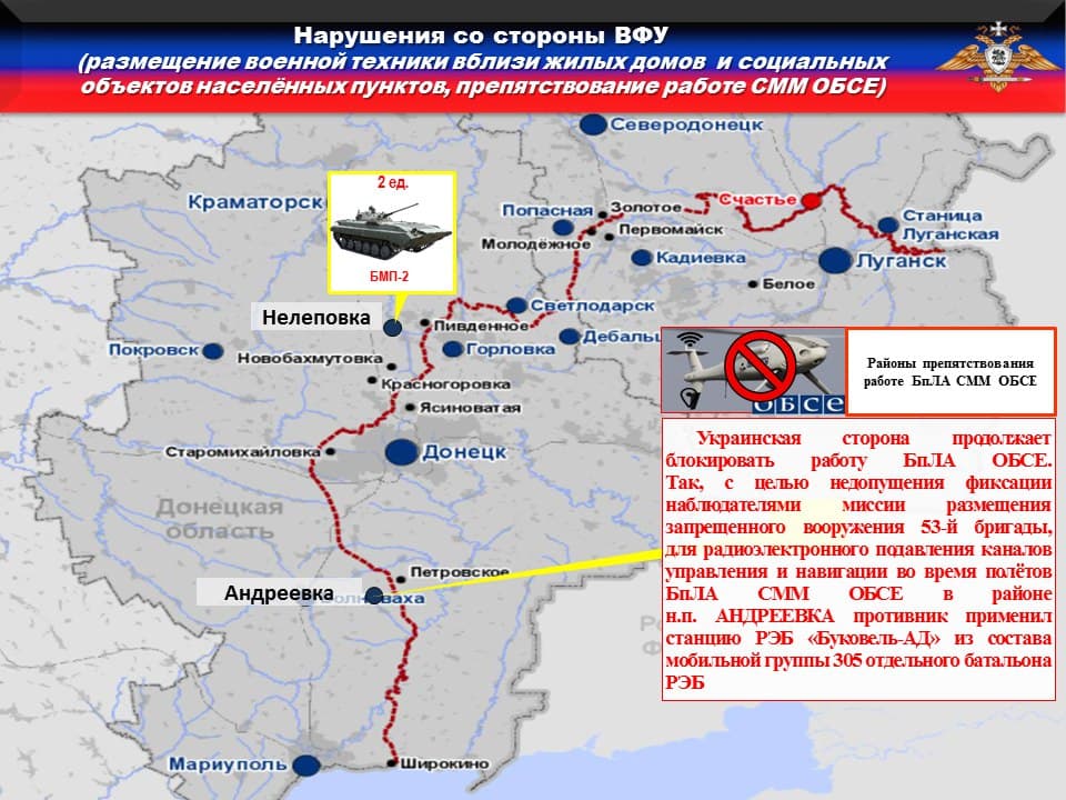 Украинская сторона продолжает блокировать работу БпЛА ОБСЕ. Так, с целью недопущения фиксации наблюдателями миссии размещения запрещенного вооружения 53-й бригады, для радиоэлектронного подавления каналов управления и навигации во время полётов БпЛА СММ ОБСЕ в районе н.п. АНДРЕЕВКА противник применил станцию РЭБ «Буковель-АД» из состава мобильной группы 305 отдельного батальона РЭБ.