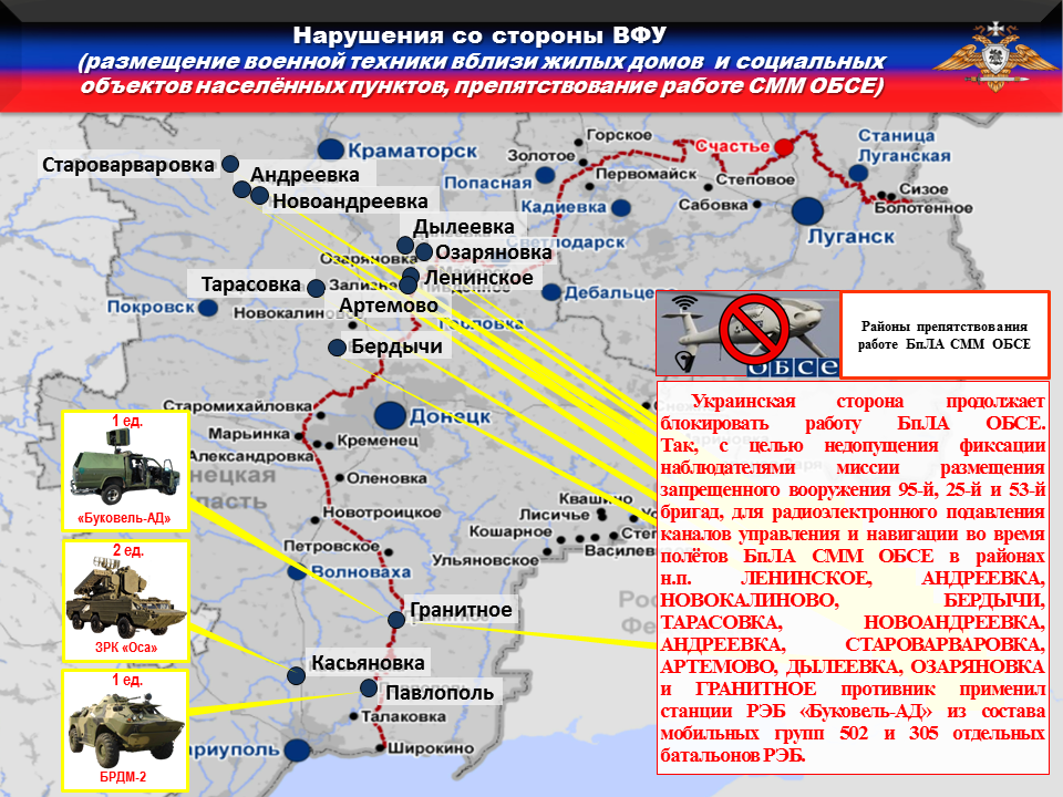 Украинская сторона продолжает блокировать работу БпЛА ОБСЕ. Так, с целью недопущения фиксации наблюдателями миссии размещения запрещенного вооружения 95-й, 25-й и 53-й бригад, для радиоэлектронного подавления каналов управления и навигации во время полётов БпЛА СММ ОБСЕ в районах н.п. ЛЕНИНСКОЕ, АНДРЕЕВКА, НОВОКАЛИНОВО, БЕРДЫЧИ, ТАРАСОВКА, НОВОАНДРЕЕВКА, АНДРЕЕВКА, СТАРОВАРВАРОВКА, АРТЕМОВО, ДЫЛЕЕВКА, ОЗАРЯНОВКА и ГРАНИТНОЕ противник применил станции РЭБ «Буковель-АД» из состава мобильных групп 502 и 305 отдельных батальонов РЭБ.