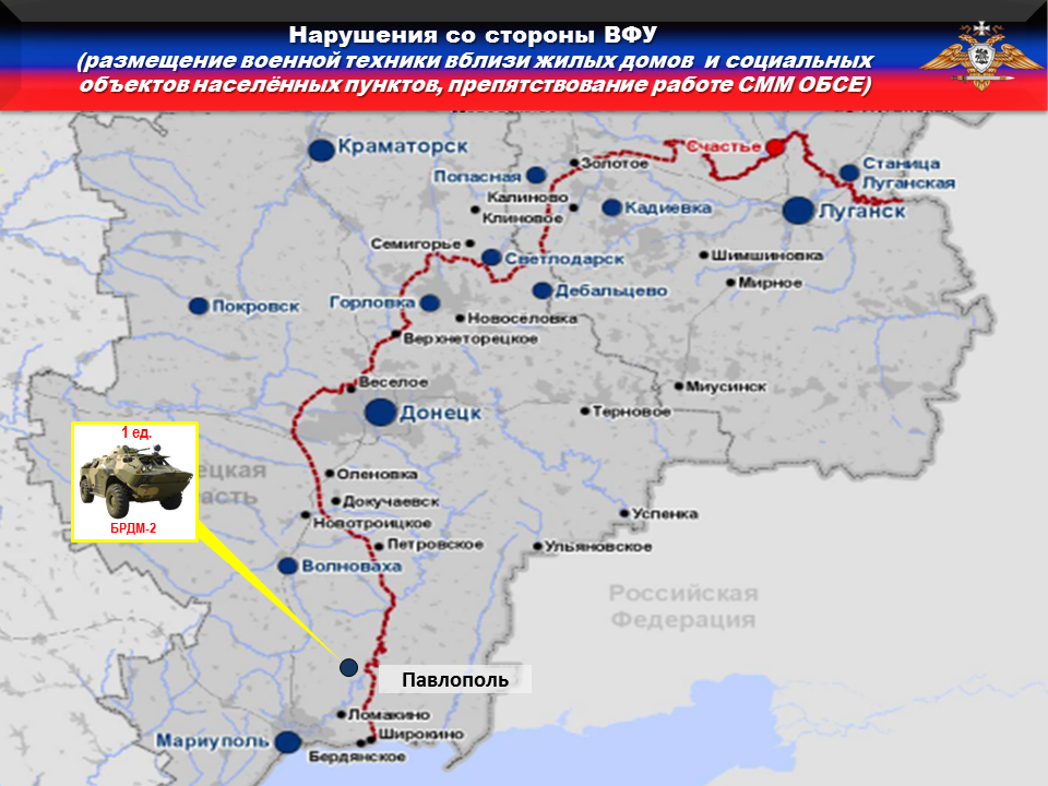 В нарушение ТРЕТЬЕГО пункта дополнительных мер, боевики из 36-й обрмп разместили боевую разведывательно-дозорную машину БРДМ-2 вблизи частного домовладения в н.п. ПАВЛОПОЛЬ.