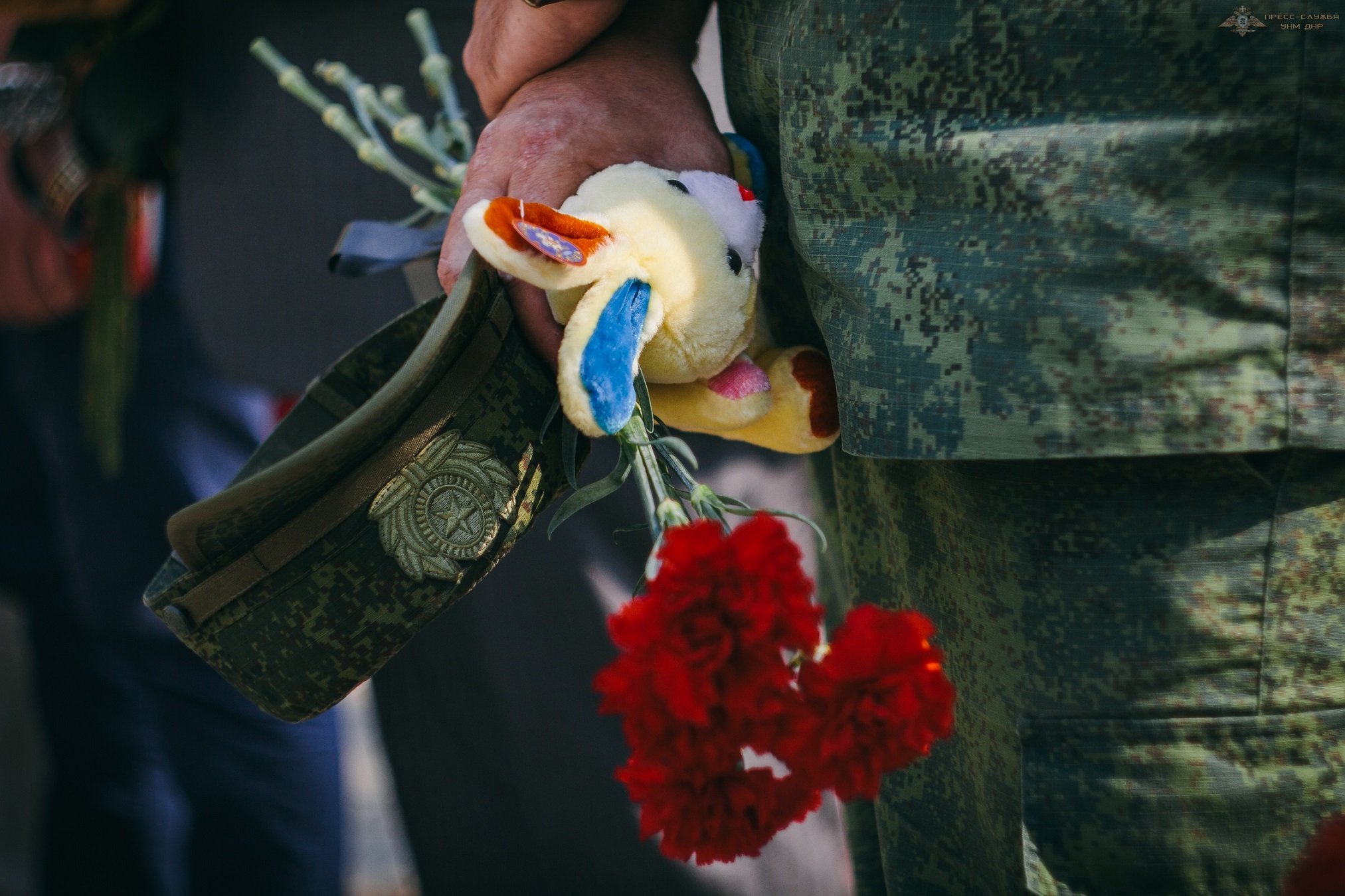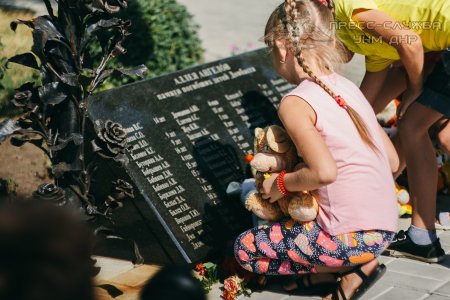 Память погибших почтили минутой молчания и возложением цветом и мягких игрушек к мемориалу с именами погибших от обстрелов детей Донбасса.
